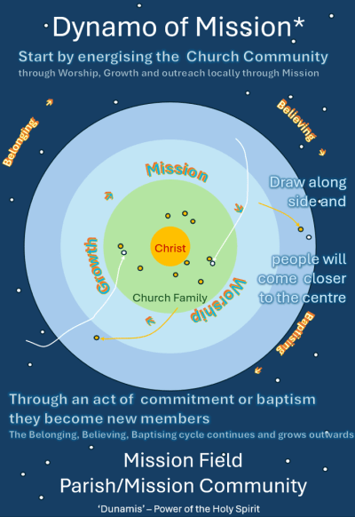 This is a Spirit led, organic model for growth which appreciates and empowers the faithful body of believers in your church and leads them on a spiral journey through different phases of faith development, supported by the core functions of the church, the presence of Christ and empowered by the dunamis or power of the Holy Spirit.